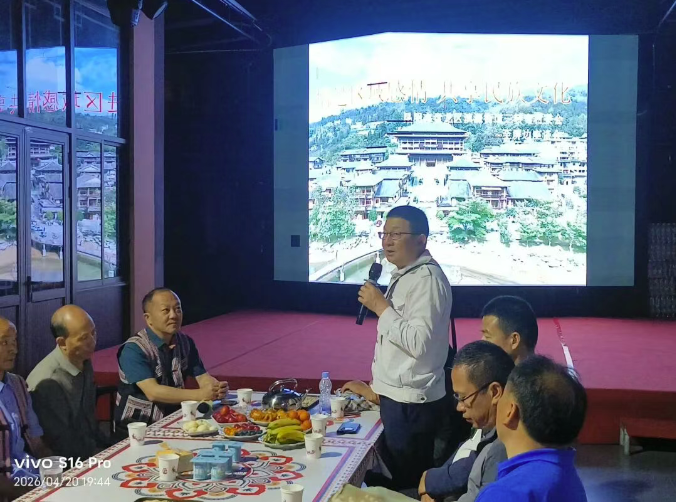 4月20日中午,考察组抵达滴水苗城。作为国家4A级旅游景区,滴水苗城占地1.4平方公里,累计投资15.9亿元,以“一府八寨”的整体格局将苗族建筑风貌、生态康养与商业运营有机融合。在黄永胜副主席的引导下,考察组重点观摩了苗式建筑风貌的打造,包括牛角城门、日月广场、苗王府、风雨廊桥等特色景观的规划设计与景观提升经验;同时还考察了斗牛场的设施与运营管理,了解民俗体育活动的商业化运营模式,以及街区商业运营中的沿街商铺、特色餐饮、文创产品等旅游消费业态布局。