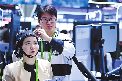 4月26日,参会人员在第四届中国(安徽)科技创新成果转化交易会上体验一款脑机接口产品。新华社记者 周牧 摄