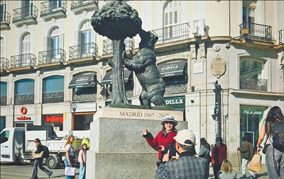 中国游客在西班牙马德里街头标志性雕塑“熊与树莓”前拍照留念。