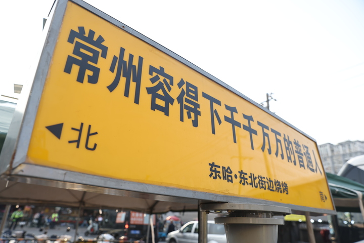 顾客的喜爱让小摊迅速有了火爆的迹象,2023年10月刚摆摊的夫妻俩在12月就转向店面经营。去年夏天,这家不起眼的小店因为一块广告牌迅速走红。2025年6月21日,“苏超”第五轮常州对战南京的比赛在雨中进行。场边,一块只光秃秃印着“东哈·东北街边烧烤”几个大字的黄色广告牌与京东、江苏银行等知名企业并列,引发网友的广泛热议。