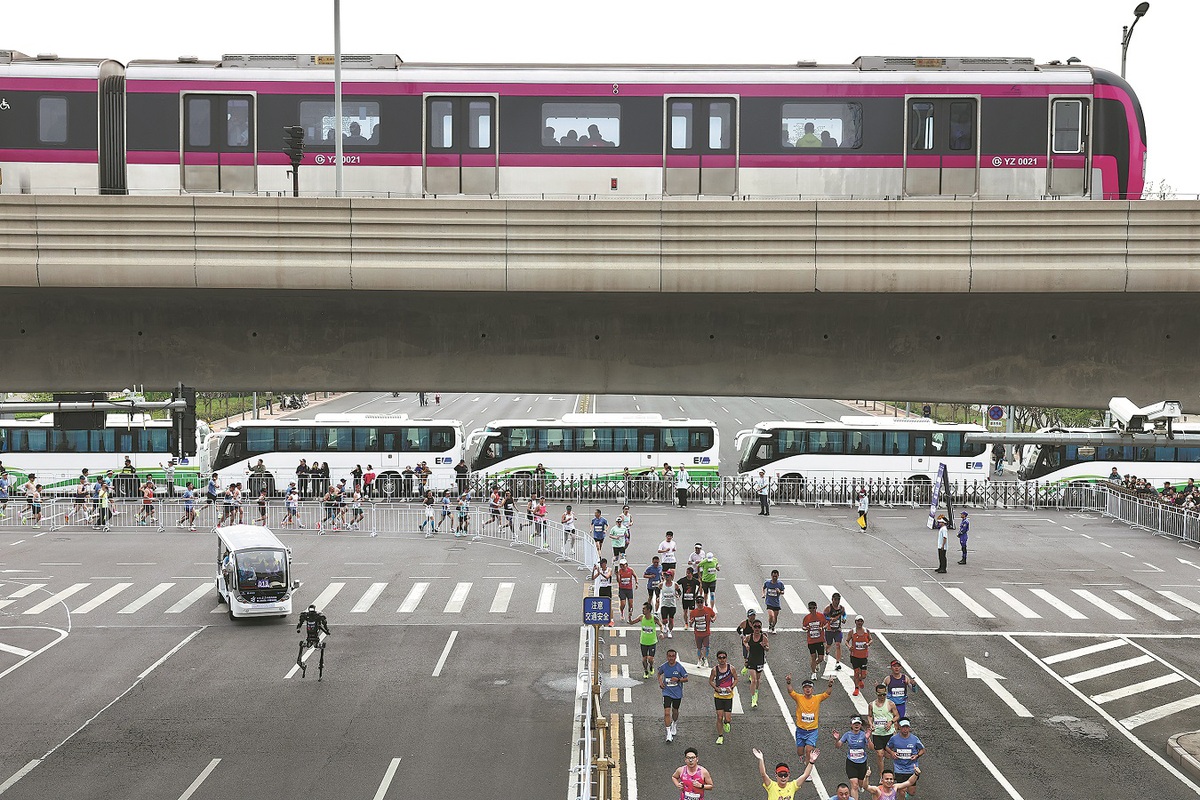 A humanoid robot together with human participants runs during the 2026 Beijing E-Town half marathon and humanoid robot half marathon in Beijing on April 19. WEI XIAOHAO/CHINA DAILY
