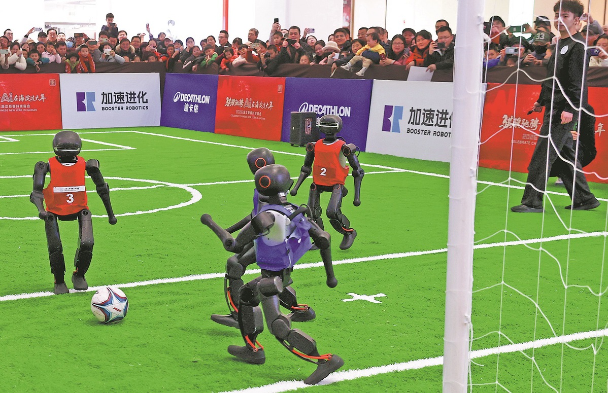 Audiences watch a robot football match during a Chinese New Year fair in Haidian district in Beijing on Feb 19. CHEN XIAOGEN/FOR CHINA DAILY