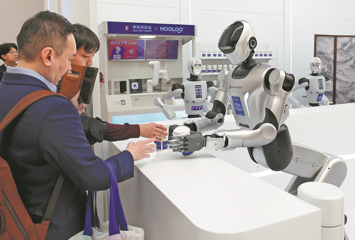 A humanoid robot serves beverage to visitors during the 2026 ZGC Forum Annual Conference in Beijing on March 25. ZOU HONG/CHINA DAILY