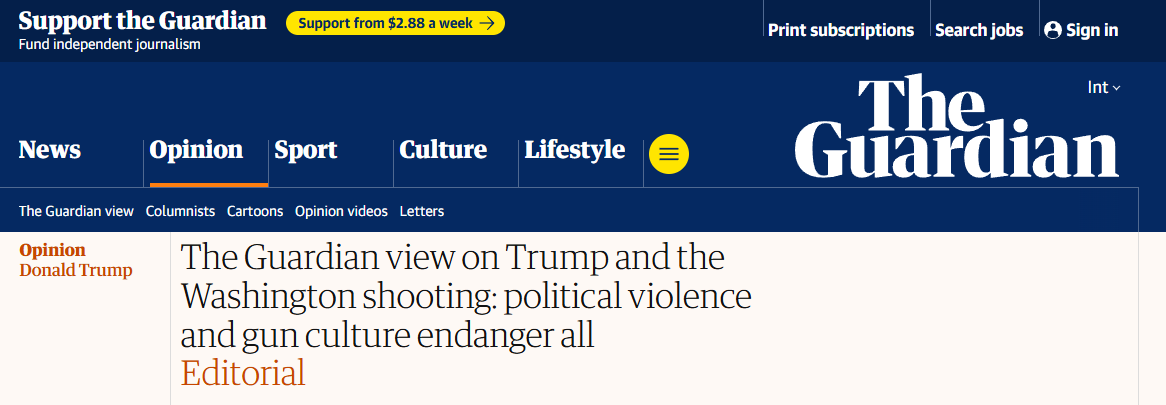 英国《卫报》日前发表社论指出,美国政治暴力与枪支文化的交织正危害所有人。文章回顾了近日华盛顿希尔顿酒店发生的枪击事件,并将其与45年前里根遇刺案相提并论,强调暴力已成为美国政治传统中难以根除的顽疾。