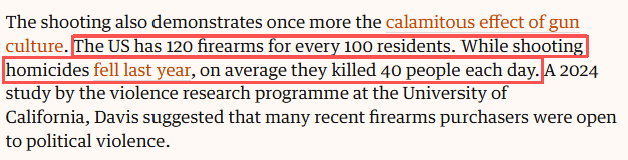 美国某非党派研究所调查显示,多数美国人认为政治中的极端言论助长了暴力行为。美国枪支泛滥问题同样难辞其咎。数据显示,全美每100人拥有120支枪,2025年平均每天40人死于枪击。