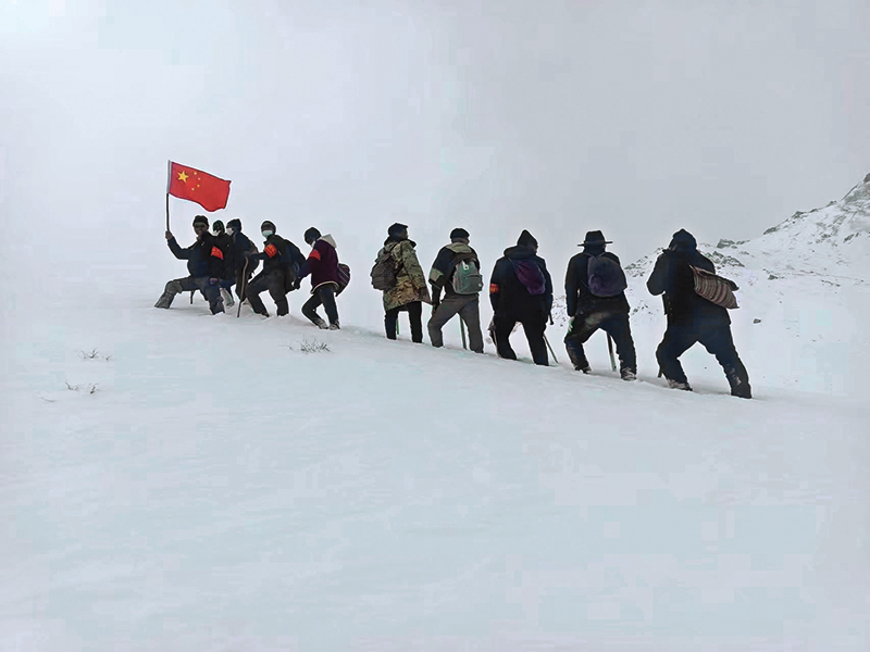 次仁罗布(左二)和村里的固边队员在巡边路上(2024年2月摄) 受访者供图
