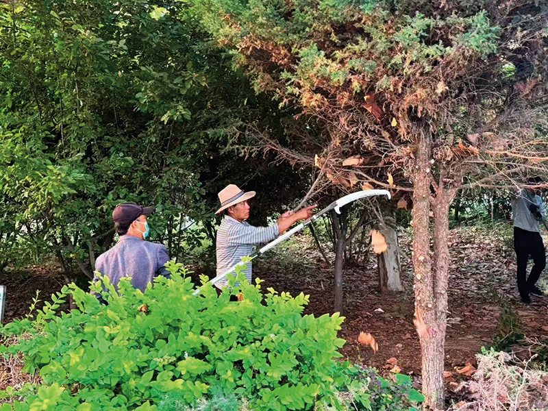 次仁罗布(右)在村里修剪树枝(资料照片) 受访者供图