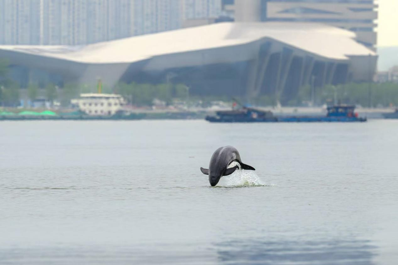 江苏省南京市长江江段,邂逅“微笑天使”,江豚跃出江面。 南京江豚水生生物保护协会供图