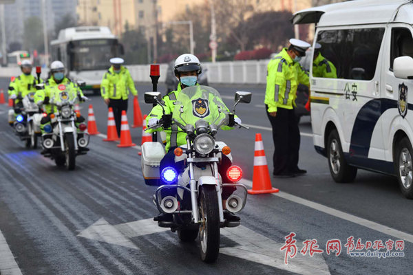 交警在青岛二中周边疏导交通。摄影 周光辉