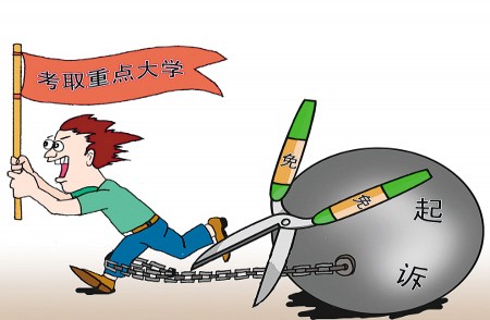 高三学生李明(化名)偷走同学4500元。检察院表示:如果考不上重点大学就起诉他。后来,他考上名牌大学,被免予起诉。