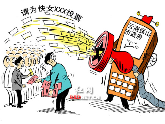 8月23日,云南保山的部分市民收到政府发出的短信,号召市民为参加选秀节目《快乐女声》的保山籍选手段林希发短信投票;此前,共青团保山市委也曾要求团员积极参与投票活动。保山团市委回应称确有其事但非强制。保山政府官员则表示此举是为了对外宣传保山的形象。(8月26日《北京青年报》)