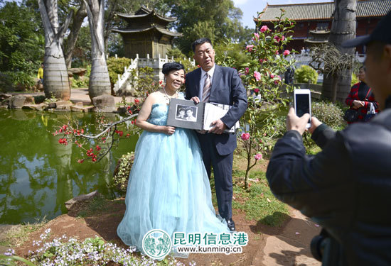6对新人中,最特殊的是一对年过花甲的老人,今年64岁的郭庆荣和61岁的何美华,结婚已经38年,第一次拍摄外景婚纱照。他们说,这次外拍活动圆了他们的婚纱梦。1977年1月23日,郭庆荣和何美华喜结连理,由于当时条件有限,他们只拍摄了一张简单的黑白照作为结婚照,现在他们拥有了一个三代同堂的五口之家。两位老人带来了他们当年的结婚照,老人精心地将照片收在相册中,其中一张是黑白的,另一张是上过颜色的,都透着历史的痕迹。“来金殿拍外景婚纱照,让我们有一种回到38年前的感觉。”这次外拍活动,两位老人一直说着感谢的话,特别开心。