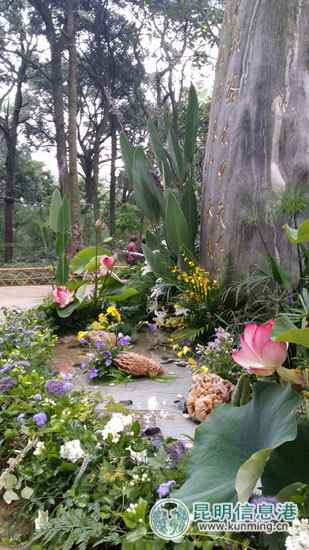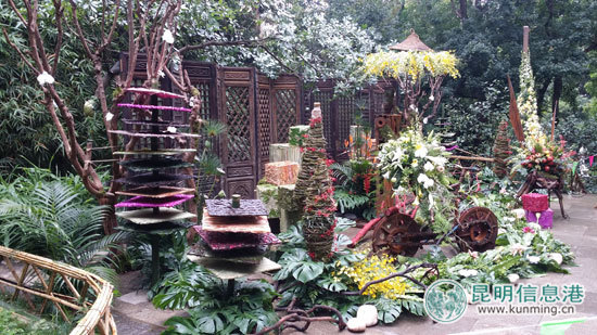 欣赏完调酒和咖啡,金殿名胜区还有一项重头戏比赛——插花比赛。从公园大殿后至钟楼间的一段游路上,一大早,昆明插花、花艺界、各公园、花卉企业等各专业团体便忙开了,用采购来的花材,现场创作花艺作品,让入园的游客和市民可以现场欣赏到专业人士创意无限的插花作品。当天现场,26组团体作品以及70余个个人插花作品令游客们应接不暇。
