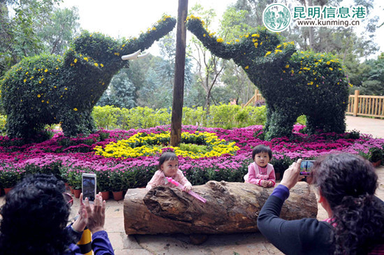 昆明动物园制作的大象菊花造型,吸引了入园的小朋友前来拍照 昆明日报 记者杨艳辉/摄