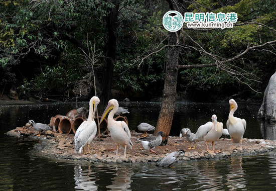 在公园水禽区,阳光正好,四只新来的鹈鹕正聚在湖心悠闲自在地啄毛,从毛色看,它们还“未成年”。远处,一只老鹈鹕独立栖息在石块上休息,并不理会这边的热闹,看起来颇有些“沧桑”的味道,它已在昆明动物园入住多年,自从8年前“丧偶”,它一直未续弦。为给它找到新伙伴,昆明动物园新引进了这两对鹈鹕。虽然老鹈鹕懒得理会“晚辈”,但4个新成员的加入确实让水禽区热闹不少。鹈鹕最大的特征就是长长的嘴以及下嘴壳与皮肤相连接处形成的大皮囊,很多人以为这大皮囊是储存食物的“冰箱”,但据动物园工作人员介绍,鹈鹕捕到的食物很快就吃掉了,所以并不需要“冰箱”。鹈鹕的皮囊主要是它捕鱼时的“网兜”和给孩子喂饭的“碗”。