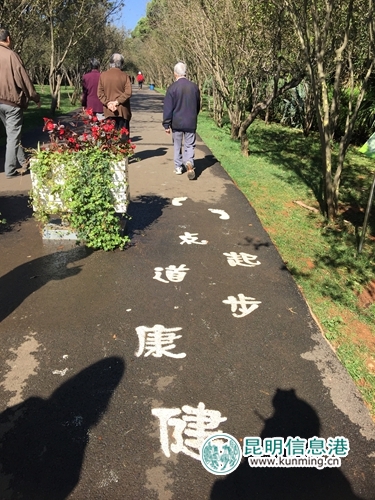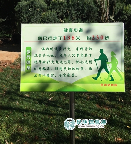 除了小朋友们喜欢的“城市果园”,昆明动物园还在海棠大道,为喜爱健身运动的游客精心打造了长达472米的健康步道。游客可以在步行的同时,感受秋冬时节海棠大道非盛花期的别样风景。公园在健康步道的起点和沿途设置提示标牌,除了标注行走距离外,还向游客介绍步行的益处,倡导大家参与步行健身,健康生活。