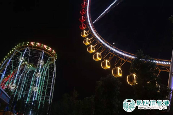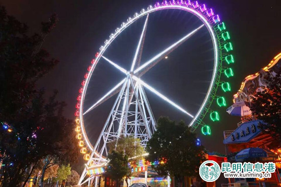 昆明信息港讯 记者杨雁 “如果夜间你从昆明西边高架桥上经过,一定会被大观楼内108米高的摩天轮上美仑美奂的彩灯吸引,这些灯光变幻出8种颜色,闪烁迷离、美不胜收,成了夜间昆明西市区的地标景观之一。”据了解,从去年10月起,为完成灯光亮化工程,大观公园西区游乐场投入300多万元对摩天轮进行灯光亮化,并对摩天轮的车厢进行了整体更换。目前,又投入100多万元,对四轮过山车进行灯光亮化,使得公园内游乐区的灯光总数达到了10万多盏,每当夜幕临近,彩灯点亮,公园就成了昆明市区最美丽的夜景之一。
