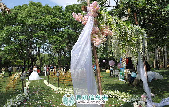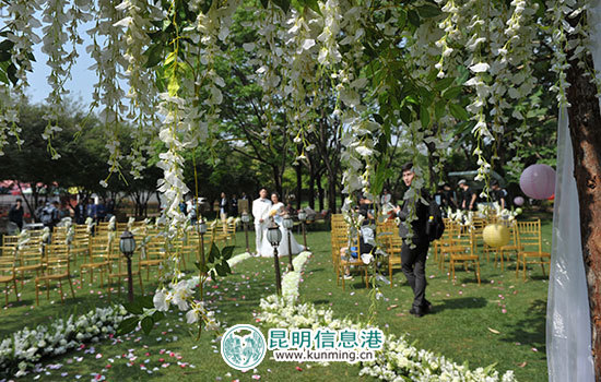昆明信息港讯 记者杨雁 许丹 4月29日,西华公园首届草坪婚礼嘉年华开幕。蓝天白云之下,纯洁无暇的百合、灿烂艳丽的玫瑰与公园内的茵茵绿草交相辉映,将公园装扮得充满了浪漫气息。西华公园发出邀请,欢迎新人们“五一”期间到公园感受浪漫草坪婚礼,共度爱的盛宴。