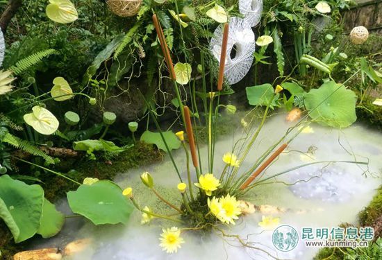 “快来看,这里有个小荷塘,里面的水还会散出烟雾来呢。”许多市民朋友驻足在一个仙气飘飘的插花作品前,这是来自花间集花艺工作室的参赛作品。据该工作室花艺师介绍,此次他们带来的参赛作品结合本次插花比赛“清风入怀”的主题,突破传统插花技艺,创新用材,在现场用近两个小时的时间制作完成了一座小型莲花池,用象征清正廉洁的莲花和池水中干冰泛起的白烟,将灵动、自然的中国现代风表现得淋漓尽致。