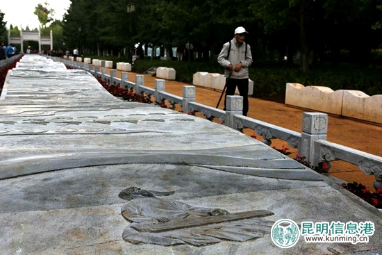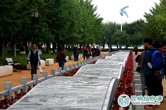 昆明信息港讯 记者李莹 杨雁 “五百里滇池奔来眼底,披襟岸帻,喜茫茫空阔无边……”一幅大观楼长联,描绘出昆明多少动人山水、诉说几代历史岁月。8月6日,在满园“绿荷红菡萏”的映衬之下,大观楼公园“长联文化大道”正式竣工迎客。近百米长的大道以石刻浮雕的形式描绘了30余幅“大观楼长联”中的景致。此外,用剩余石料和采石工具搭建的艺术造景“石头记”也同期与游客见面。