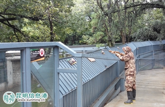 昆明信息港讯 记者李莹 11月9日上午8:40分,昆明动物园猛兽区马来熊笼外活动场电网突然失效,一只马来熊沿树杆攀爬至上层游览栈道逃脱并造成一名游客右手臂受伤。事件发生后,工作人员立即疏散游客,兽医在猛兽区栈道旁的树上发现出逃的马来熊,用麻醉枪瞄准射击,成功将其麻醉并放回笼舍进行完全隔离。与此同时,医护人员立即对游客受伤部位清创包扎,确认游客无碍。这场惊心动魄的“马来熊出逃记”,原来是昆明动物园组织的一次动物突发事件应急处理演练。