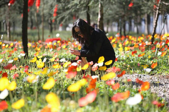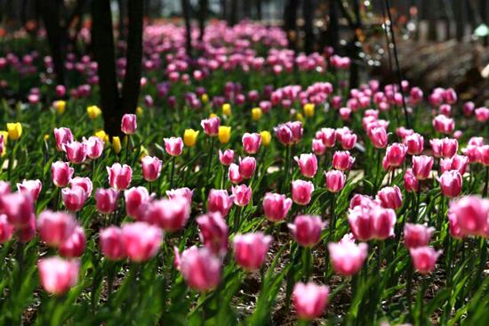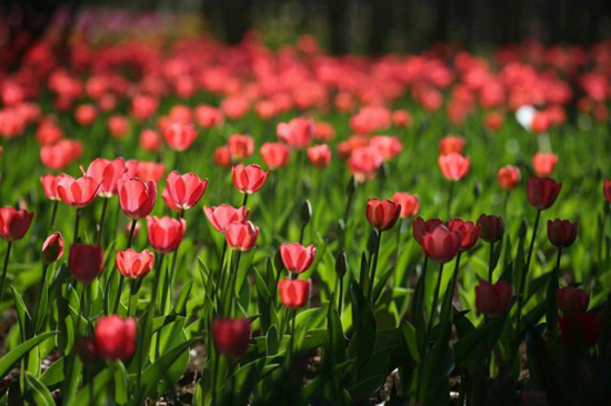 而最夺人眼球的是面积达2万多平米的林下郁金香花海。近20个不同花色品种的几十万株郁金香叶片整齐,长势喜人,一个个亭亭玉立、饱满圆润的花蕾欲吐芳菲,竞相绽放的花朵娇艳欲滴,红、黄、紫、粉等色交相辉映。一阵春风吹来,淡淡芬芳沁人心脾。市民和游客在这里不但能尽享无与伦比的视觉盛宴,而且还能在眼花缭乱的色彩世界中感受闻名遐迩的荷兰库肯霍夫郁金香花海异域风情。