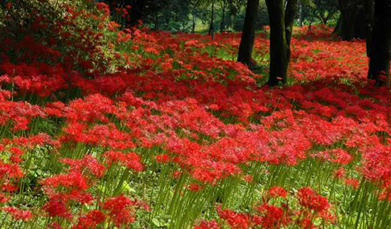 曼珠沙华,又称彼岸花、荼蘼。春分前后三天叫春彼岸,秋分前后三天叫秋彼岸。是上坟的日子。彼岸花开在秋彼岸期间,非常准时,所以才叫彼岸花。一般认为曼珠沙华是生长在三途河边的接引之花。花香传说有魔力,能唤起死者生前的记忆。她是开在黄泉之路的花朵,在那儿大批大批的开着这花,远远看上去就像是血所铺成的地毯,又因其红的似火而被喻为”火照之路” 也是这长长黄泉路上唯一的风景与色彩. 人就踏着她的指引通向幽冥之狱。