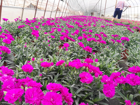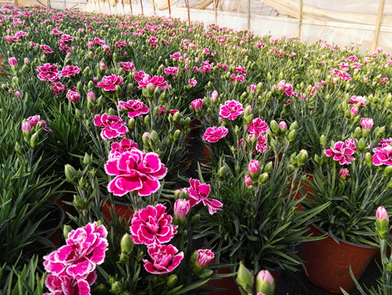 康乃馨,原名:香石竹,英文名:Dianthus caryophyllus.又名:狮头石竹、麝香石竹、大花石竹,拉丁文名:Dianthus caryophyllus L. 石竹科、石竹属多年生草本,高40-70厘米,全株无毛,粉绿色。茎丛生,直立,基部木质化,上部稀疏分枝。叶片线状披针形,顶端长渐尖,基部稍成短鞘,中脉明显,上面下凹,下面稍凸起。花常单生枝端有香气,粉红、紫红或白色;花梗短于花萼;宽卵形,顶端短凸尖,花萼圆筒形,萼齿披针形,边缘膜质;瓣片倒卵形,顶缘具不整齐齿;雄蕊长达喉部;花柱伸出花外。蒴果卵球形,稍短于宿存萼。花期5-8月,果期8-9月。