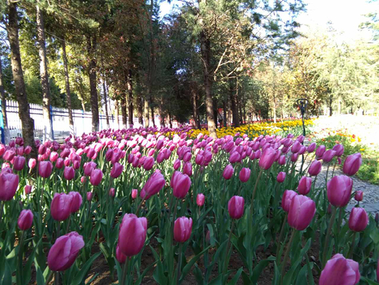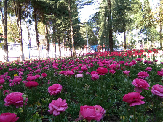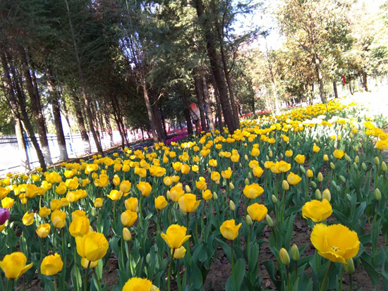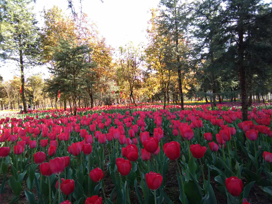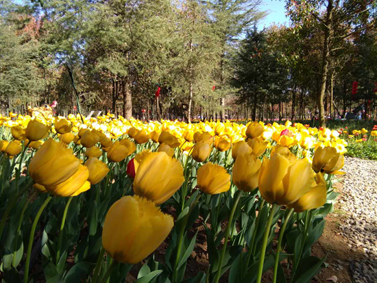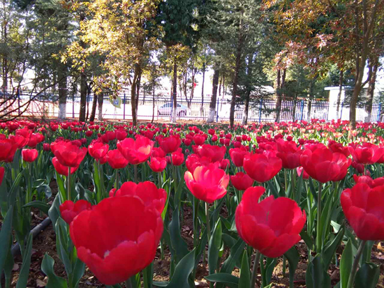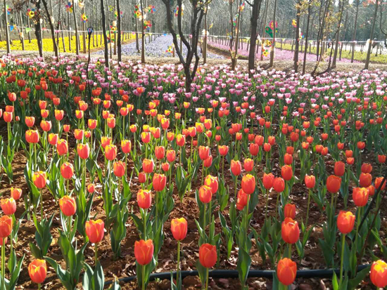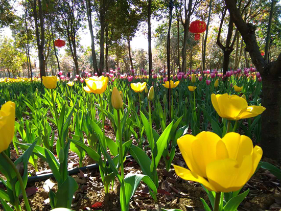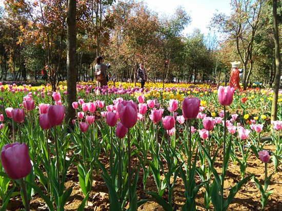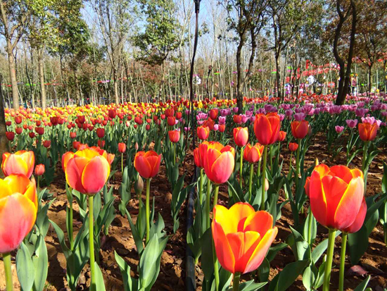昆明信息港讯 嵩明县首届“郁金香文化节”2月10日起在嵩明小街云南省花卉示范园区内的昆明花仙子公司绚烂开展,本次花展将持续到3月20日,红、黄、紫、粉等10余个不同花色、20多个品种的30万株郁金香亭亭玉立、娇艳欲滴,饱满圆润的花蕾欲吐芳菲,面积达2万多平米。此外,园中将展出风信子、虞美人、芝樱等百余种花卉,总面积超过5万平方米,其花展盛况难得一见。本周起,花仙子林下花海迎来最佳赏花期,感兴趣的市民可以来这里赴一场花卉盛宴。