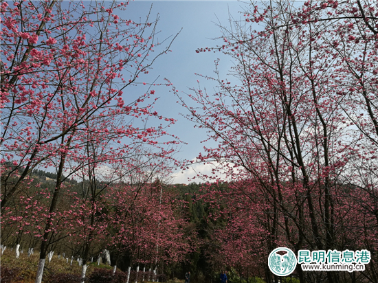 除了桃花,从公园东门进入,3000余株云南樱花也刚进入初开时节,灿若红霞,构成了一派“桃樱争春”的美景。