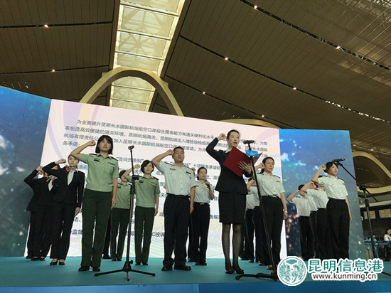 昆明机场航空口岸共建成员单位对社会公布服务保障承诺并进行集体宣誓。记者上官艳君/摄