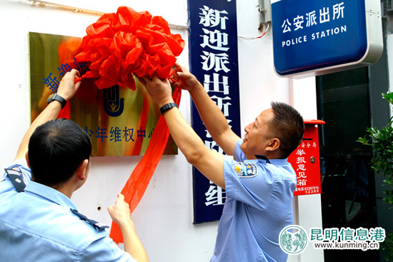 昆明信息港讯 记者合宇聪 8月31日上午,昆明市公安局盘龙分局新迎派出所青少年维权中心揭牌成立。派出所将依托该中心分色预警及派出所在全省首例引进专业驻校社工等工作。坚决遏制和防范涉校(园)案(事)件、事故的发生,关注未成年人保护的社会需求,最大限度保证青少年的身心健康。