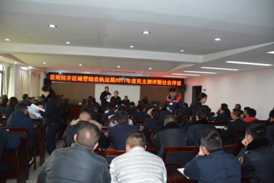 2017年11月23日昆明经济技术开发区城市管理综合行政执法局、机关第十支部组织开展了2017年度民主测评暨社会评议,全体党员干部职工、管委会相关委办局代表、服务对象代表对经开区城管综合执法局干部、职工进行了评议打分。