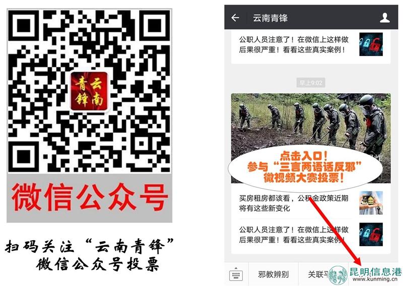 方式一:关注“云南青锋”微信公众号,通过菜单按钮进入大赛专属页面进行投票:
