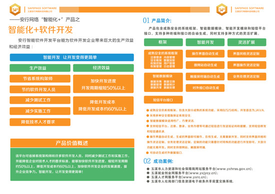 云智能开发平台项目以我公司自主研发的安行智能开发平台为基础,将智能开发放到云端,以“互联网+”的模式来进行推广,实现智能开发的普及化和项目资源与开发资源的跨区域整合利用,同时在互联网上搭建一个基于“功能材料”的软件功能市场,让软件行业像建筑行业一样规范化,让软件功能市场像建材市场一样方便和细分化。目前智能开发行业刚刚兴起,同类产品不多,而且都只局限在内部生产、产品销售和项目式推广的营销模式上,我公司利用自有产品能够在线生产、灵活扩展且能在线加载扩展功能的特点,将其放到云端,采用云生产和云销售的模式来整合项目资源和开发资源,同时利用生产成果即插即用的特点,在该平台上搭建一个基于“功能材料”的软件功能市场,让软件功能像建材一样可以方便灵活的进行买卖和使用。目前产品研发只进行到第一阶段,即实现内部生产的智能开发,该阶段的成果为安行智能开发平台1.0版本。安行智能开发平台是一款在线的软件开发工具型平台,适用于信息管理类WEB软件的智能开发,是一款针对开发人员的在线生产工具。平台极大的降低了开发的难度,生产人员大部分时间只需要配置一下即可生成想要的功能,对于特殊的需求也可以很快的定制集成,极大的加快了开发的进度,降低了开发成本,同时也降低了对生产人员的技能要求,能为企业带来极大的生产效益和经济效益。平台生产的软件可含智能模块,智能模块与应用领域结合也能实现各领域的智能化。目前我公司在该平台上生产出来的智能产品为智能政务和智能数据两款产品。与市场上同类产品比较,我们的优势在于更加灵活开放,可以云模式运营,可以支持其他领域的智能化三方面。