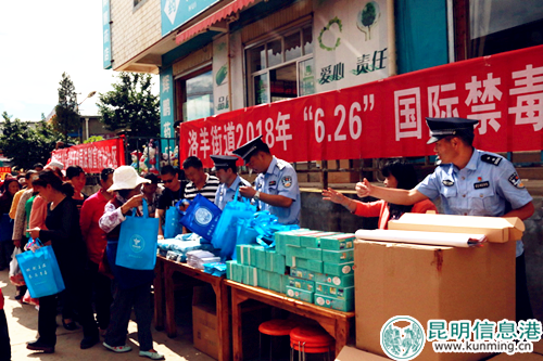 为进一步加强禁毒宣传和教育工作,提高辖区群众识毒、防毒、拒毒能力,在2018年“6•26”国际禁毒日当天,经开区公安分局组织5个工作组在辖区小洛羊农贸市场、新兴职业学院、昆明市第三中学经开区学校、普照村农贸市场及国际银座开展禁毒宣传活动。