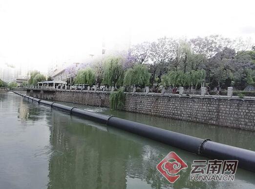 盘龙江里出现的非常长的输水管,其实为第四、第五水质净化厂尾水传输工程,每天的输水量为10万立方米。工程共需建设9585米传输管道,截至5月20日已完成6500米管道铺设工作。预计本月底主体工程完工通水。