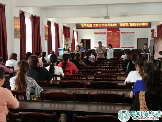 昆明信息港讯 通讯员庄洪滪 8月23日上午,昆明经开区洛羊街道办事处大新册社区居委会进行保育员(初级)劳动技能培训班的结业考评。