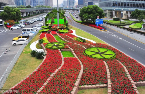 人民广场“秋实满园”立体花坛花团锦簇,造型独特引得中外游客驻足观赏
