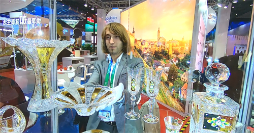 进博会捷克国家馆展台上的各色水晶制品,在璀璨灯光下炫彩晶莹。在悠扬的捷克钢琴曲中,捷克金发小伙米洛斯拉夫·施奈尔戴着白手套擦拭展台上一套波希米亚皇家水晶器皿。
