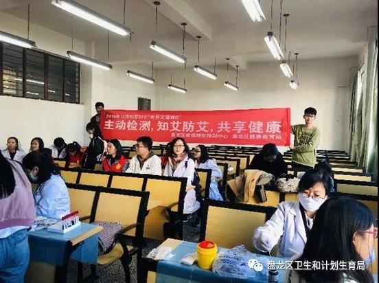 2018年11月30日,在第31个“世界艾滋病日”来临之际,为了进一步普及艾滋病相关知识,让防艾知识走进校园,促进学生主动检测,消除对艾滋病患者的歧视,提高安全套的使用率,有效降低艾滋病的感染率,盘龙区防艾办、区疾控中心、区健康教育所,在辖区云南农业大学、西南林业大学、昆明理工大学三所高校开展“主动检测、知艾防艾、共享健康”主题系列活动。