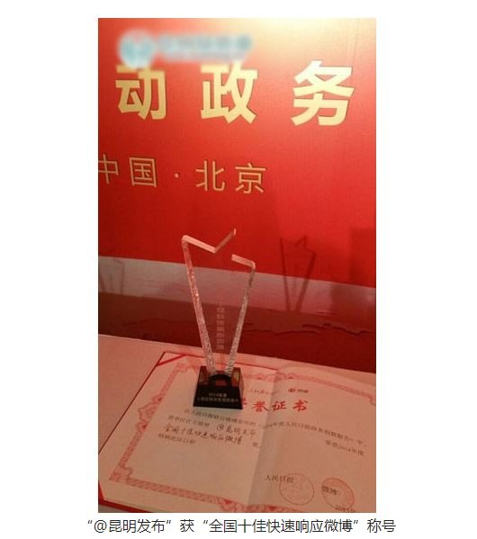 1.2015年1月27日“新形势新常态新思维”2015移动政务峰会上,“@昆明发布”获得“全国十佳快速响应微博”称号。