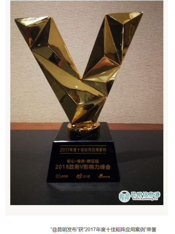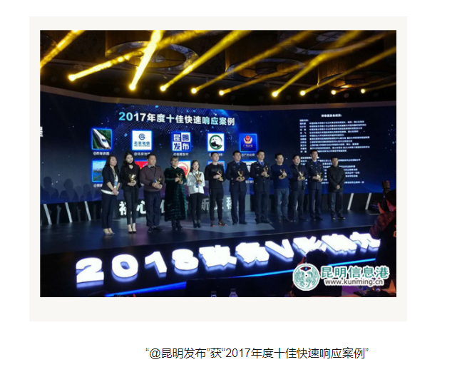 1.2018年1月23日,“2018政务V影响力峰会”上,“@昆明发布”收获了“2017年度十佳矩阵应用案例”、“2017年度十佳快速响应案例”两项殊荣。