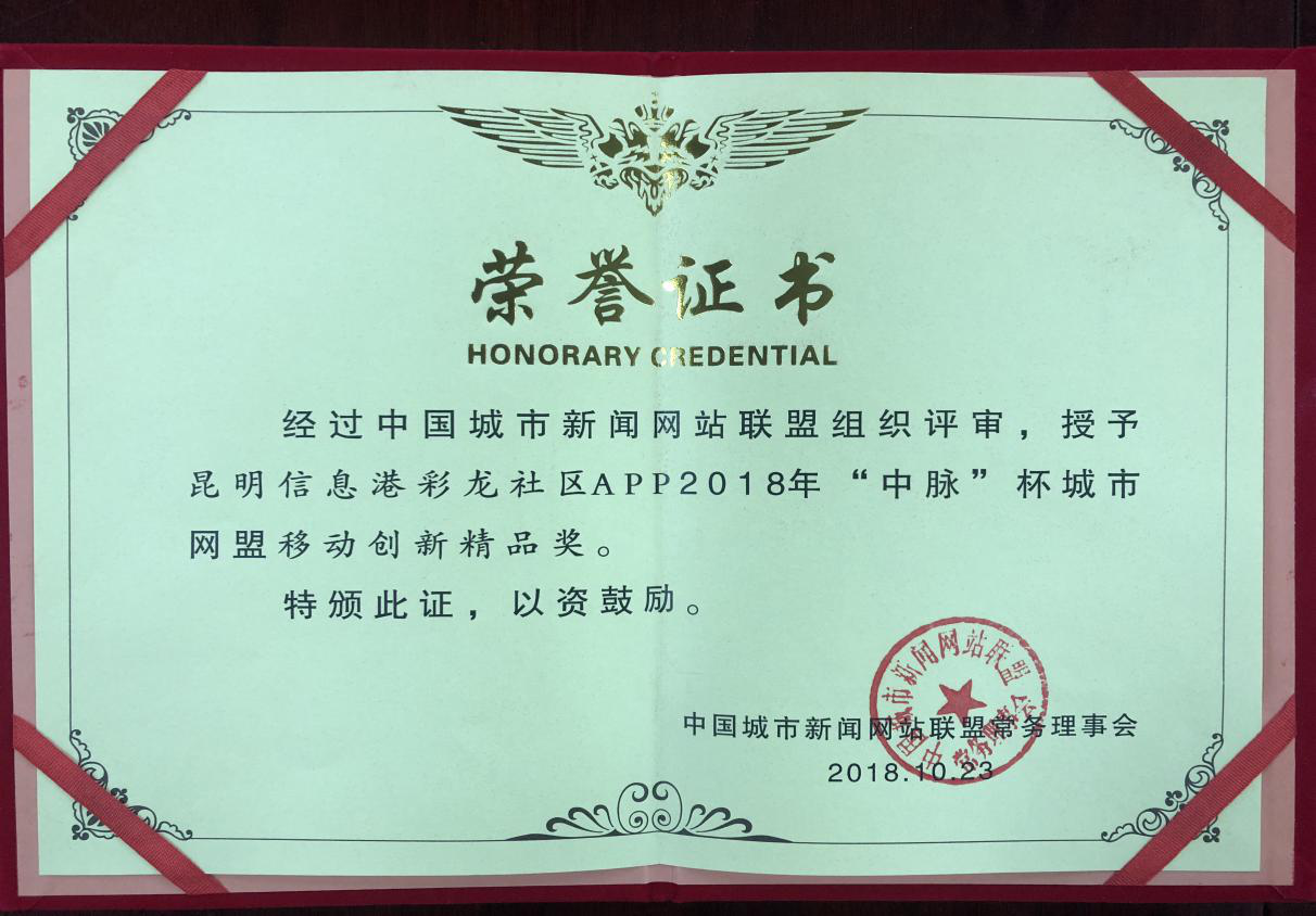 3.2018年10月23日,中国城市新闻网站联盟举行颁奖仪式,昆港彩龙社区APP荣获“移动创新精品奖”;《一周昆明》栏目荣获“品牌栏目优秀奖”。