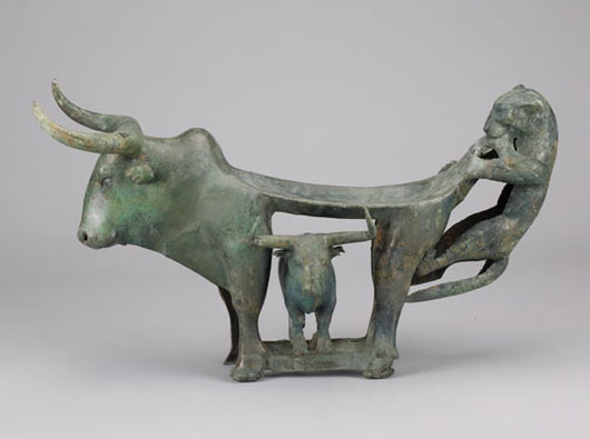 介绍:战国牛虎铜案,是云南青铜文化艺术的杰作,也是云南省博物馆的镇馆之宝。它出土于江川李家山墓葬群中墓坑最大,随葬品最多的24号墓。器物主体为一头大牛,站立状,牛角飞翘,背部自然下落成案,尾部饰一只缩小了比例的猛虎,虎做攀爬状,张口咬住牛尾;大牛腹下中空,横向套饰一只站立状小牛。大牛与小虎用模铸造,一次成型,小牛则另铸再焊接于大牛腹下。作为滇国的一件祭器,牛虎铜案在力学和美学上都达到了极高水平,几近完美。