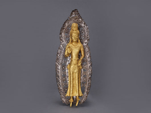 介绍:大理国时期作品,1978年出土于大理崇圣寺主塔。“阿嵯耶”一名出自《南诏图传》,也被称为“真身观音”,为南诏、大理国时期独有,是佛教传入大理国后世俗化的结果。造像由纯金打造,观音高髻双辫,髻中藏佛,手结妙音天印;它,上身袒露,下身着裙,裙饰阴刻U形纹;赤足,足下有方柱形榫头,身后饰银质长葫芦形镂空雕花背光。造像面相恬静,略带笑容,身段线条优美,长裙装饰如湿衣出水,被看作是最早传入云南的观音造像,貌如时人,透着浓烈的时代气息和地方特色,被称为“云南福星”。