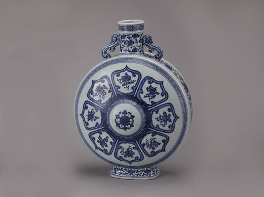 介绍:1961年云南省博物馆工作人员从昆明市五华区废品收购站带回这件抱月瓶,收购价格不足百元。2010年,同类抱月瓶出现在香港苏富比春拍卖行,成交价高达842万港币。49年里,同样一件瓷器价格相差百万倍。盛世兴收藏,古今中外,皆如此。这件抱月瓶底部有大清乾隆年制篆款,器身两面都描绘佛家八吉祥纹饰,分别为法螺、法轮、宝伞、白盖、莲花、宝瓶、金鱼、盘长结。画工以点染的笔法涂抹青料,欲模仿明代永乐宣德朝青花使用的进口钴料呈色效果。