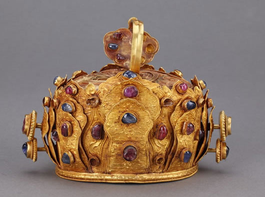 介绍:明代,高11.5厘米、底径11厘米 重320克,出土于云南沐氏家族墓之沐崧夫妇合葬墓。该器呈半球形,由形似莲花瓣的薄金片,内外四层累叠而成。冠面镶嵌有红、蓝、绿、白等各色宝石20多粒。冠顶插有一如意形嵌宝石簪,沿顶簪两侧各插有一对镶红宝石和镶蓝宝石的笄。这顶曾被王侯使用过的金冠,集中融会了多种工艺技法,如捶揲、錾刻、镂空、镶嵌、焊接等,充分反映了明代金器制作水平的高超。