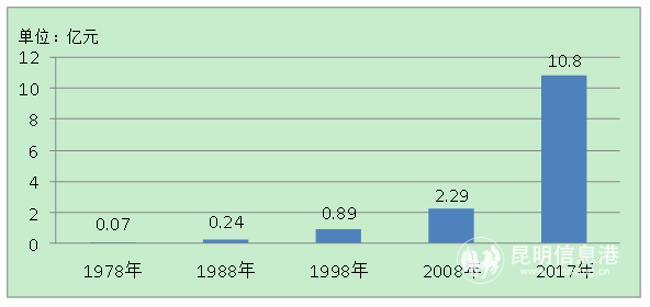 经济总量持续扩大。1978年全县地区生产总值达0.64亿元,2017年达117.95亿元,40年翻了接近14番。分阶段看,1988年达1.85亿元,增长2.91倍,年均增长11.2%;1998年达12.95亿元,增长20.23倍,年均增长16.7%;2008年达34.36亿元,年均增长10.6%,增长53.97倍;2017年达117.95亿元,增长184.30倍,年均增长11.3%(如图1)。人均地区生产总值从1978年的245元增加到2017年的36450元,增长150倍,年均增长13.3%。