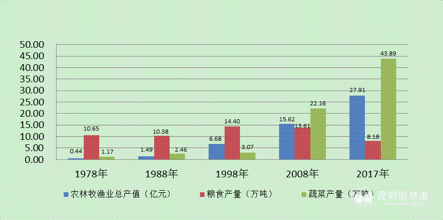 农业生产稳步发展。全县第一产业增加值由1978年的0.33亿元增加到2017年的15.94亿元,增长48倍,年均增长10.4%。2017年,蔬菜、水果产量分别达43.89万吨、0.82万吨,比1978年增长37.51倍、6.96倍;花卉种植从忽略不计到全国领先,产量达1232.1吨(鲜切花42893.9万枝),粮食产量为8.18万吨。全县农林牧渔业总产值达27.91亿元,比1978年的0.44亿元增长63.43倍,年均增长11.2%。近年来,随着农村综合改革不断深化,乡村振兴建设稳步推进,逐步形成了“菜、花、米、果”四大主导产业,农业龙头企业达30家,农村专业合作社达182个,菊花种苗出口稳居全国第一,成功创建为第二批国家农产品质量安全县。农业产业结构和布局不断优化,壮大了农村经济,提高了农民收入,彻底改变了农村贫穷落后的面貌。